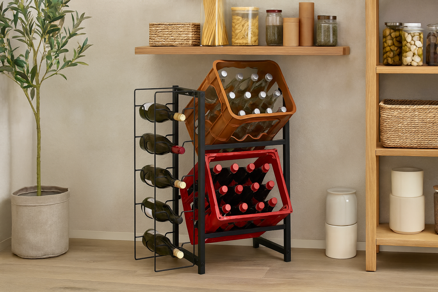 Beverage crate rack & wine rack, 5 wine bottles and 2 crates Beverage crate rack & wine rack, 5 wine bottles and 2 crates