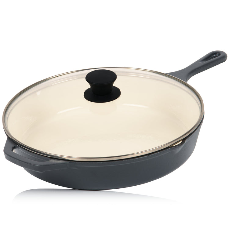 The cast iron frying pan is compatible with almost all gas, electric, and induction cooktops, as well as other types of cooktops. With this grill pan and lid, you can cook, fry, and braise anywhere. Every dish is a breeze to prepare.