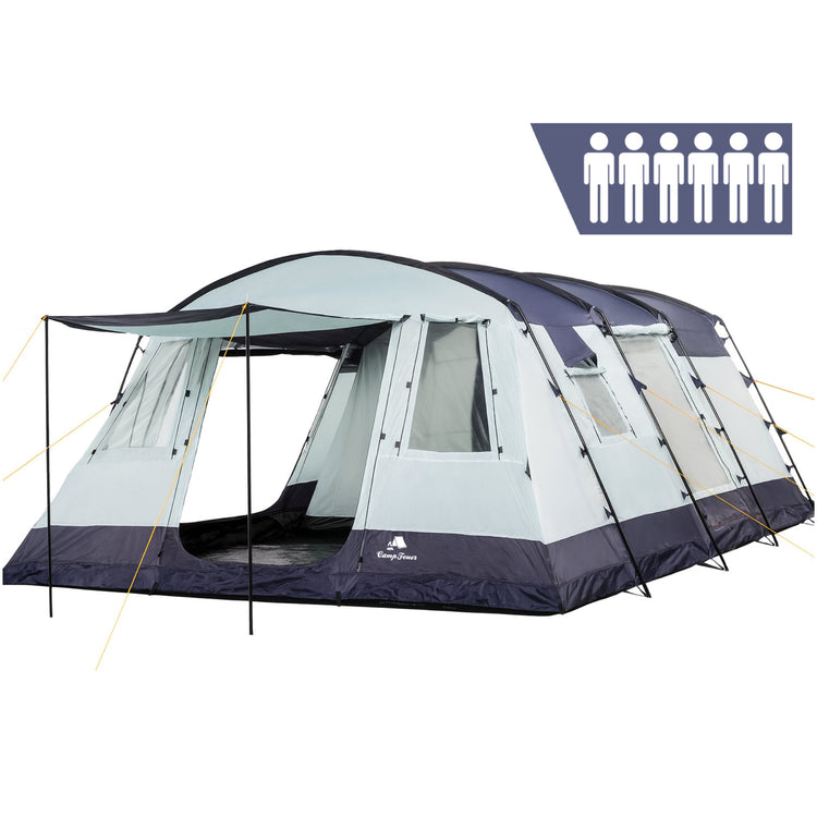 Tente CampFeuer XtraL pour 6 personnes, imperméabilité 5000 mm, bleu foncé/gris, tente tunnel XXL avec vestibule