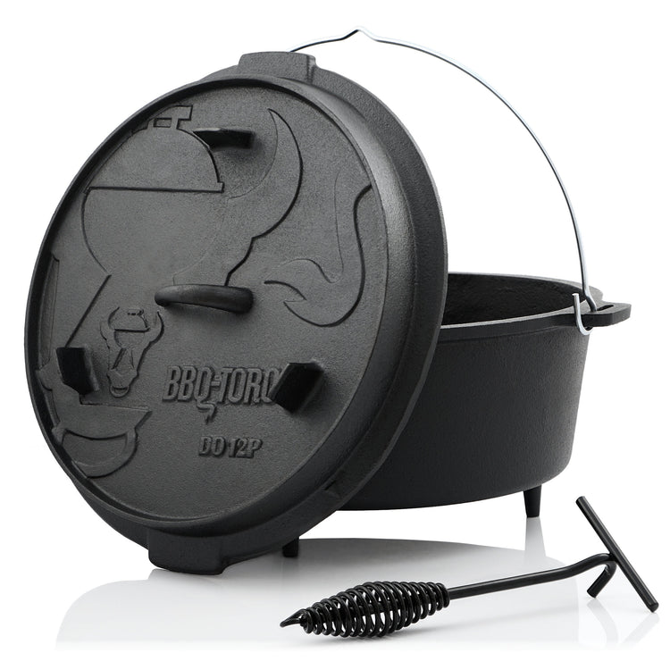 Der Dutch Oven ist ein schwerer, traditioneller, gusseiserner Topf und ein exakt passender Deckel mit dem man überall kochen, braten, schmoren, frittieren, dünsten und backen kann. Der Dutch Oven reguliert dank seiner hohen Masse (Gusseisen) ungleichmäßige Hitze und ermöglicht so ein gleichmäßiges Garen. Einfach glühende Kohlen, Glut oder Grillbriketts auf den Deckel und unter den Topf geben und das Dutch Oven-Erlebnis kann losgehen. Der extra erhöhte Deckelrand und die drei Beine (Modell mit Füße) bieten optimale Bedingungen für Kohle und Co.
