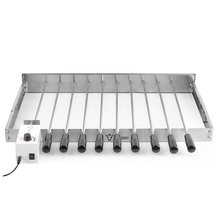 BBQ-Toro Edelstahl Grillaufsatz mit 10 Spießen und Motor vorne links | Rahmen größenverstellbar (B) 58 x (T) 26-40 cm | elektrisch