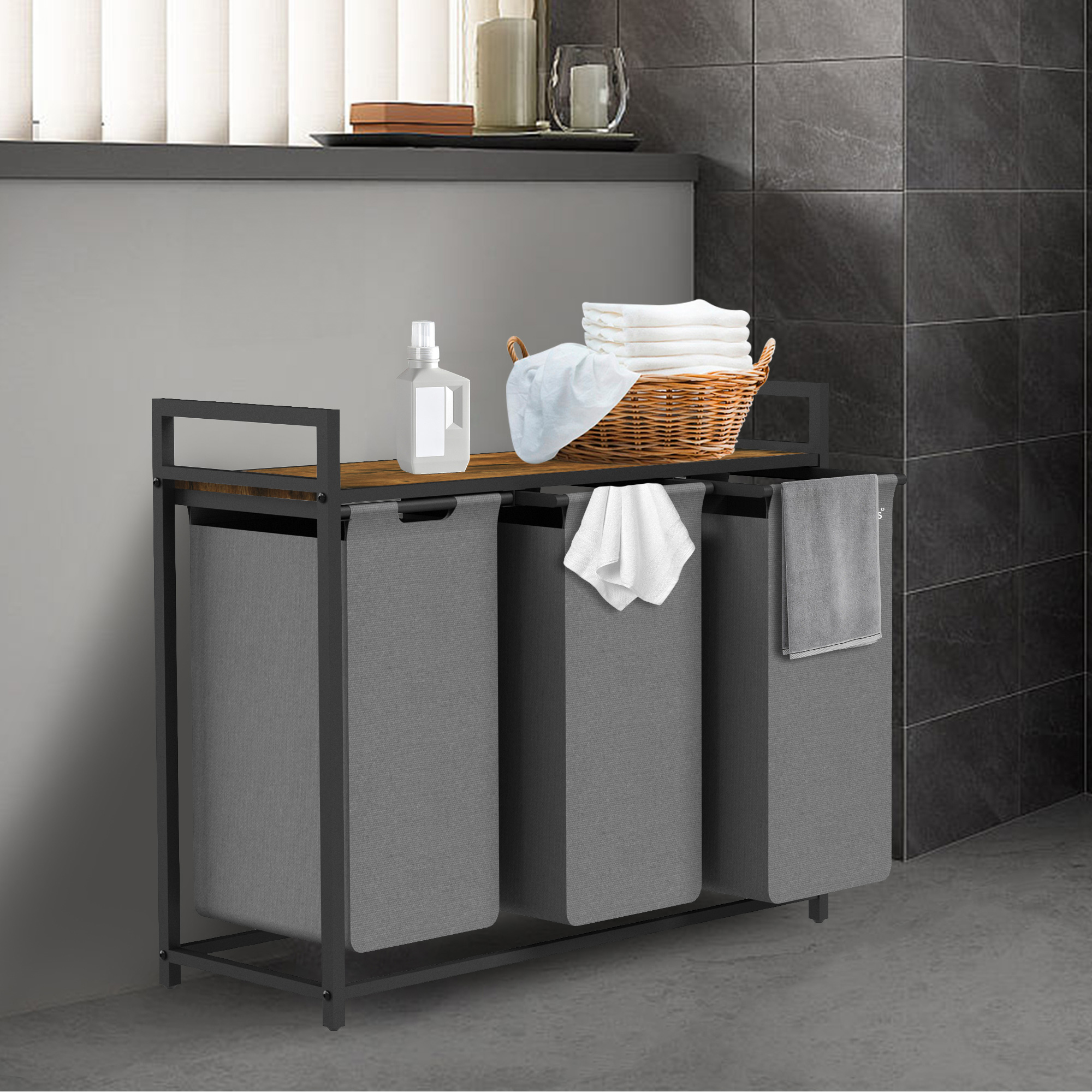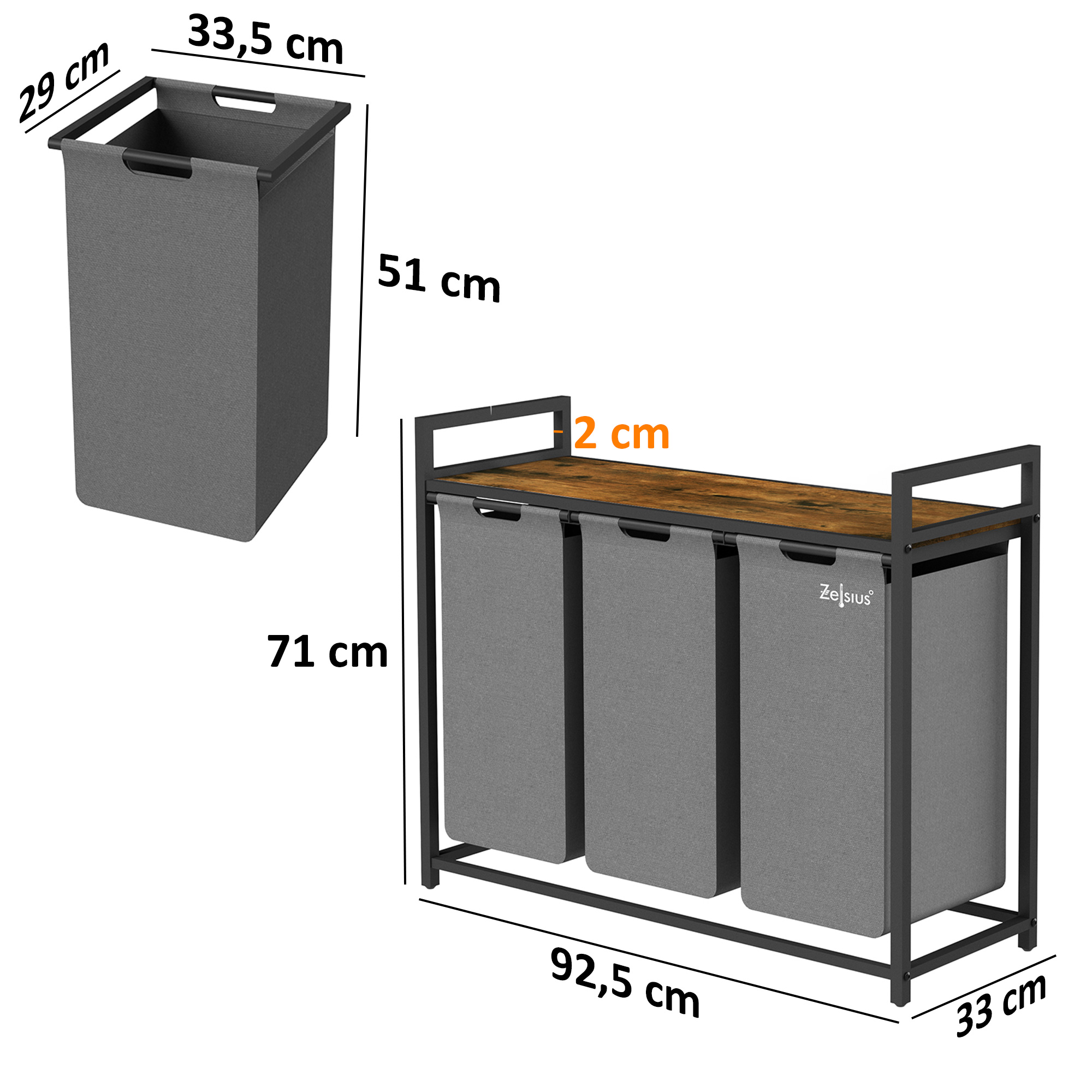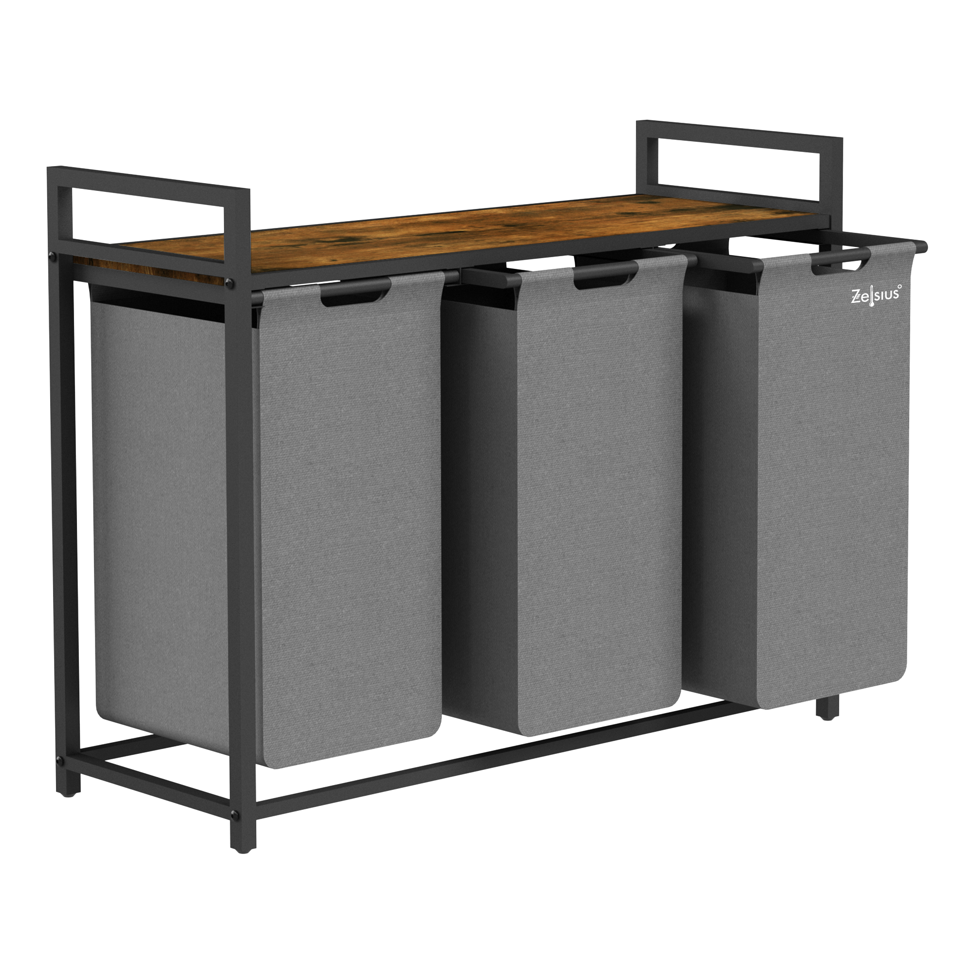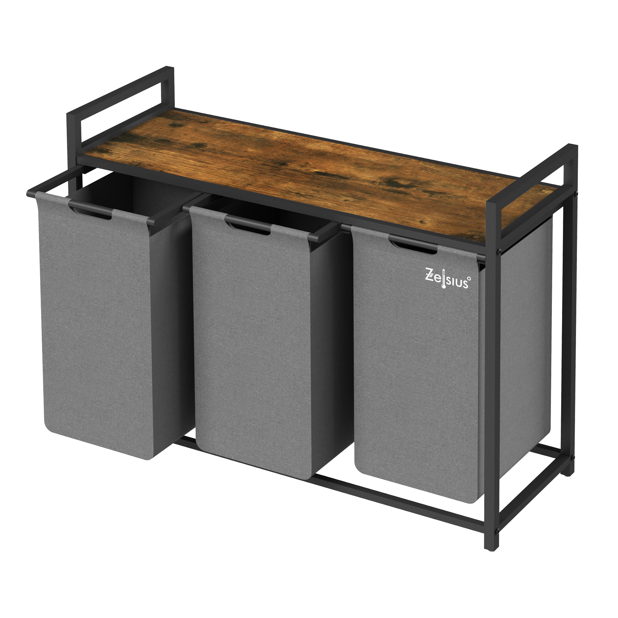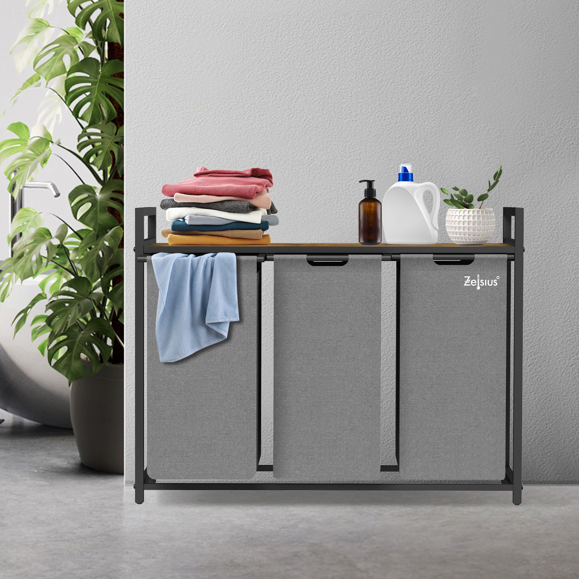 Der Zelsius Wäschesammler mit Ablage ist die ideale Ergänzung für Ihr Badezimmer, Ankleidezimmer oder Schlafzimmer. Dank der drei ausziehbaren Behälter können Sie schmutzige Kleidung, Bettwäsche und andere Textilien separat sortieren und aufbewahren.