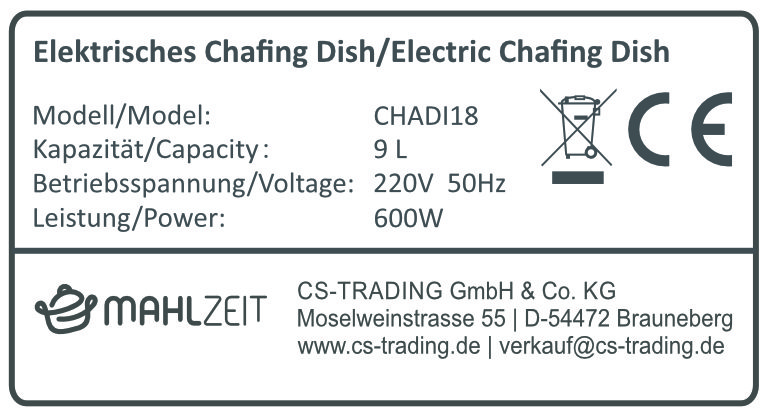 - Lieferumfang: 1x Chafing Dish elektrisch, 1x GN 1/1 Behälter, 1x Deckel