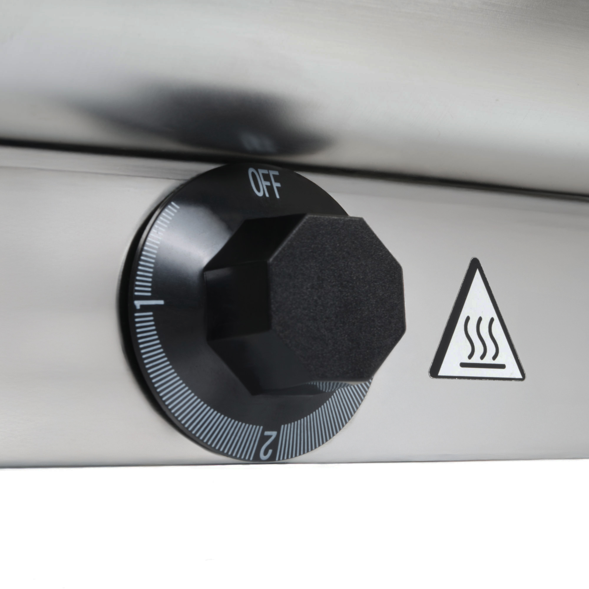 Das Thermostat ist über einen Drehknopf bis 80°C regelbar. Der Elektrowärmer hält Ihre Speisen über mehrere Stunden servierbereit. Die vier rutschfesten Füße sorgen für einen sicheren Stand des Wärmebeckens.