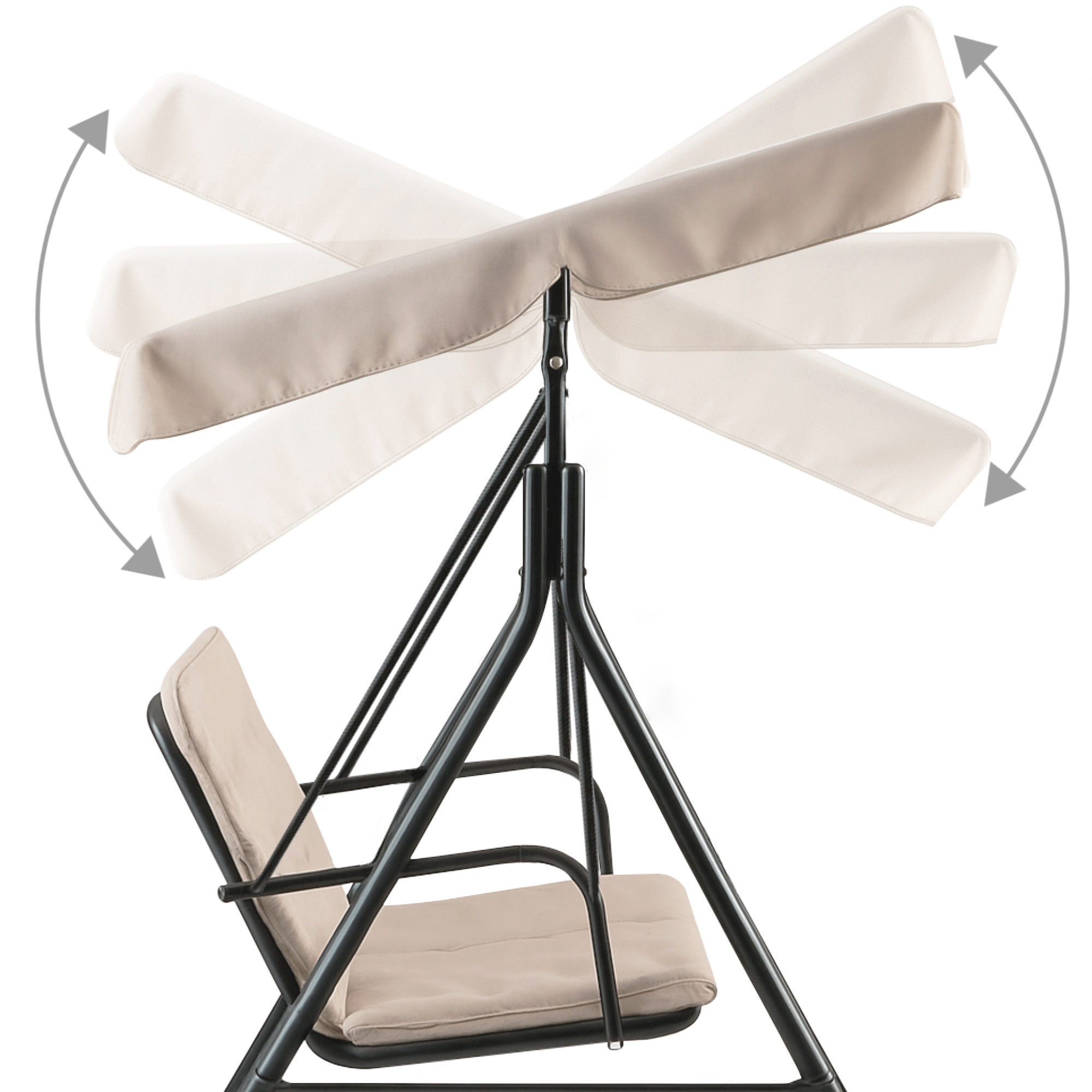 Das Sonnendach mit den Abmessungen 176 x 106 cm ist individuell neigbar und lässt sich flexibel einstellen, sodass wahlweise Sonne oder angenehmer Schatten genossen werden kann. Der seitlich herabhängende Stoff verleiht der Schaukel zugleich ein dekoratives und stilvolles Erscheinungsbild.