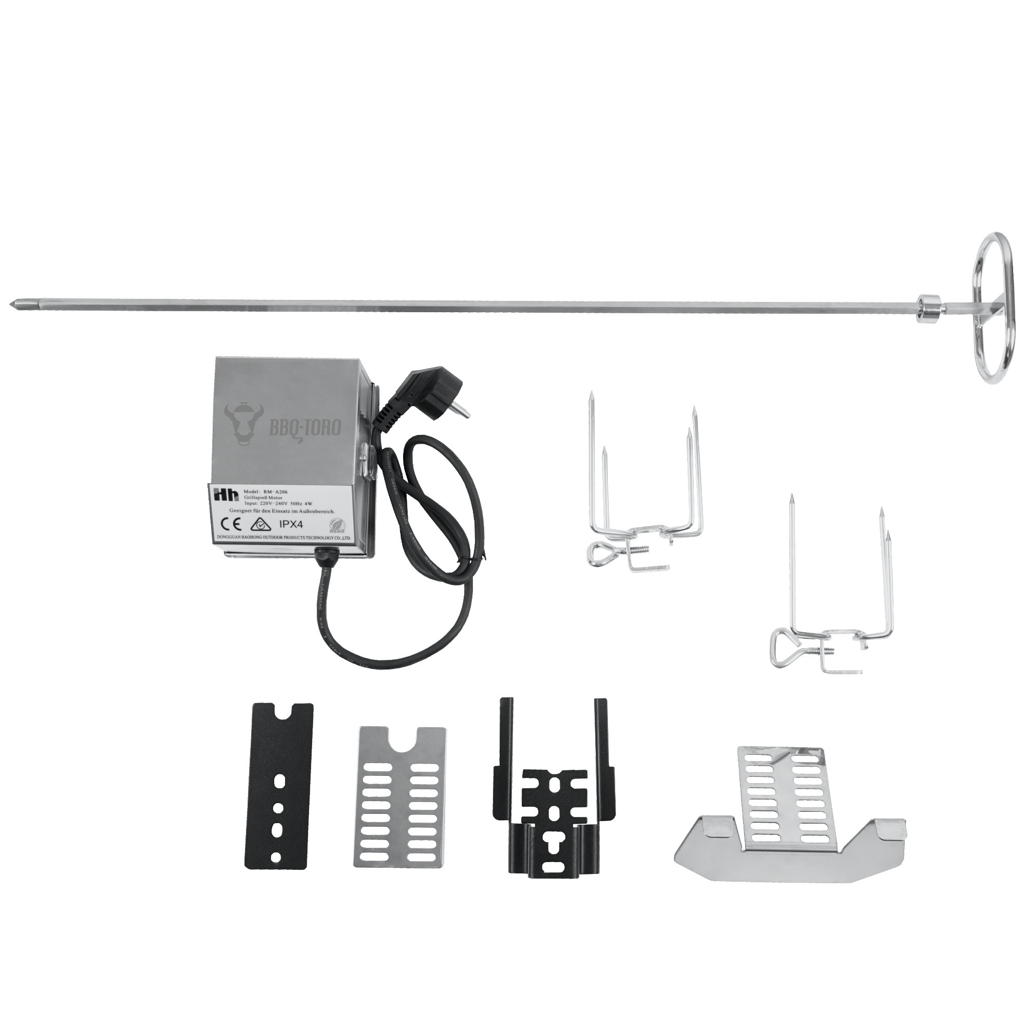 Komplette Rotisserie inkl. 220V - 240V - Grillmotor (in Edelstahlgehäuse) und Befestigung (Motorhalter). Das Spießset kann mit nur wenig Aufwand an Ihren Grill montiert werden. Die Anleitung enthält leicht verständliche Abbildungen.